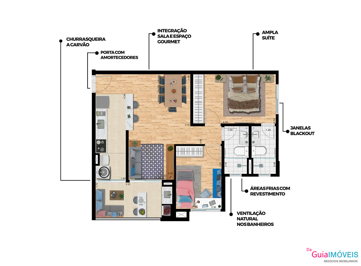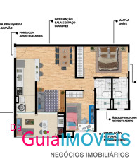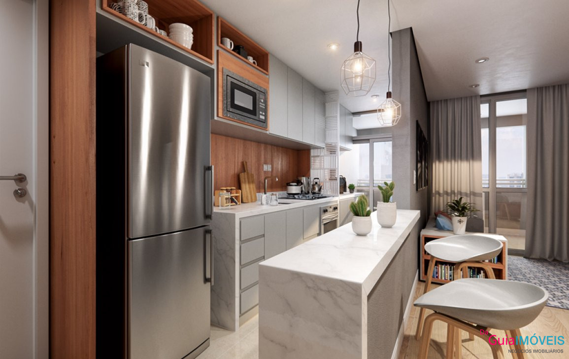 2 Dorms. sendo 1 com Ampla Suíte, Terraço Gourmet com Churrasqueira a Carvão Integrado com Cozinha e Sala